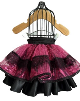 The Fabric: Sparkle tulle with Velvet bodice, brass buckle at the neck.